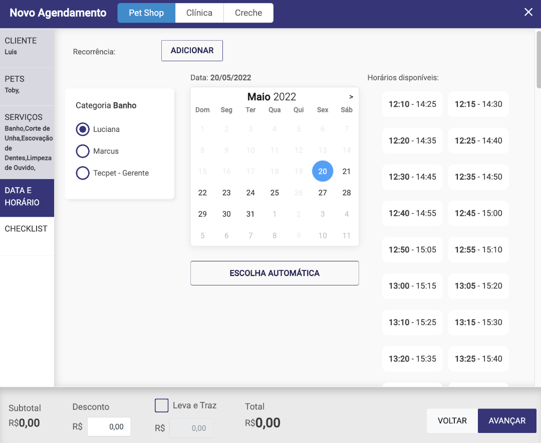 Como última etapa, chegamos na revisão do agendamento, contendo as informações como valores, serviços, checklist, nome do pet, nome do cliente, data e horário agendado.