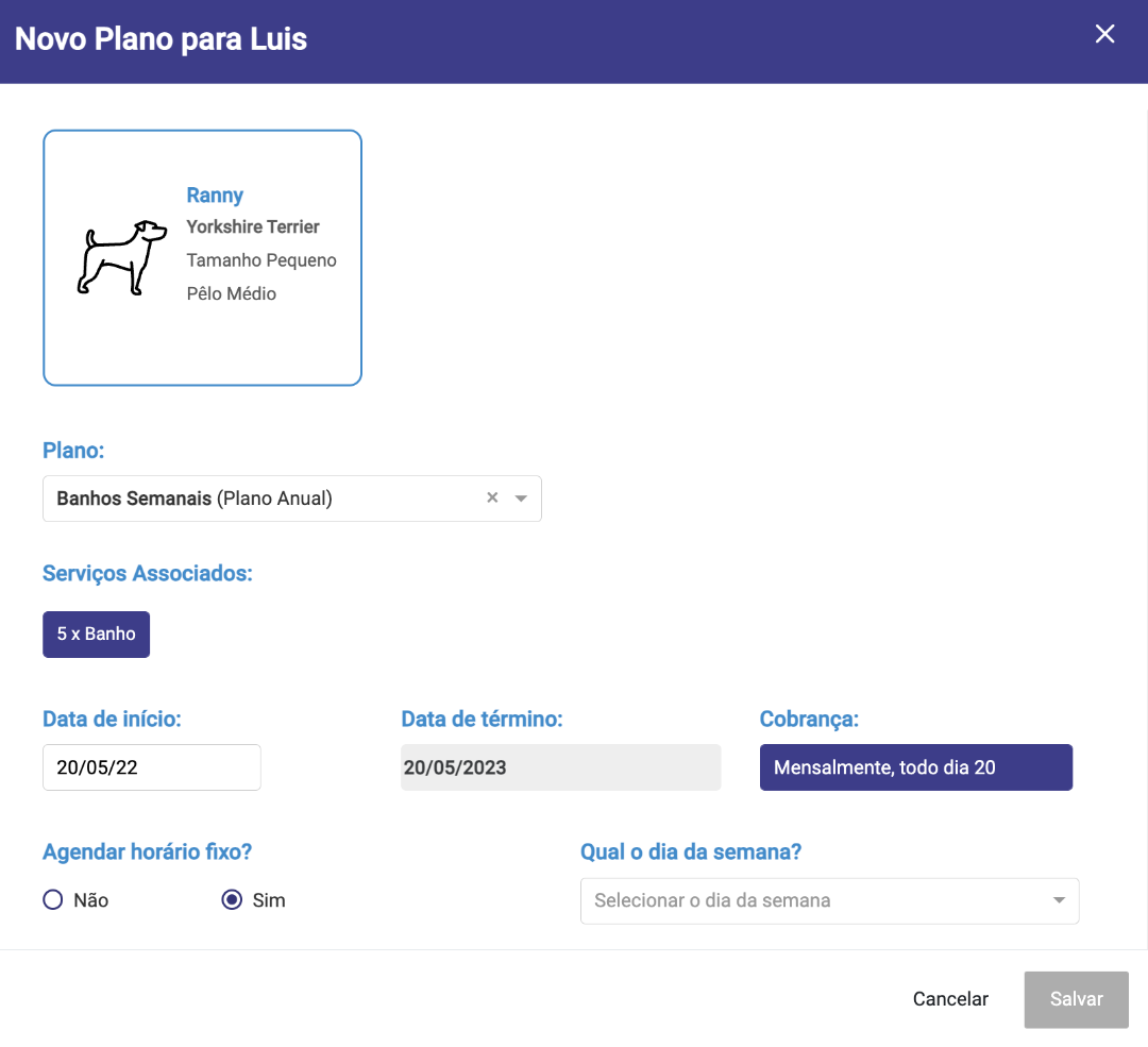 Nessa etapa, precisamos selecionar o Pet, o plano ou pacote que iremos realizar a venda, logo abaixo, ele já trás as informações dos serviços que estão inclusos dentro do plano/pacote e sua quantidade. A data de início pode ser tanto uma data retroativa, como uma data futura, porém a data de término sempre será o período exato do plano/pacote Ex: Pacote de Banho com duração de 1 mês, ou seja, se a data de início for em 01/05/2022 a data de término será 01/06/2022. Logo abaixo, as informações seriam Agendar Horário Fixo (Essa informação já é auto selecionada através do preenchimento do serviço no plano/pacote). No caso de dias fixo, será possível selecionar o dia e o horário.