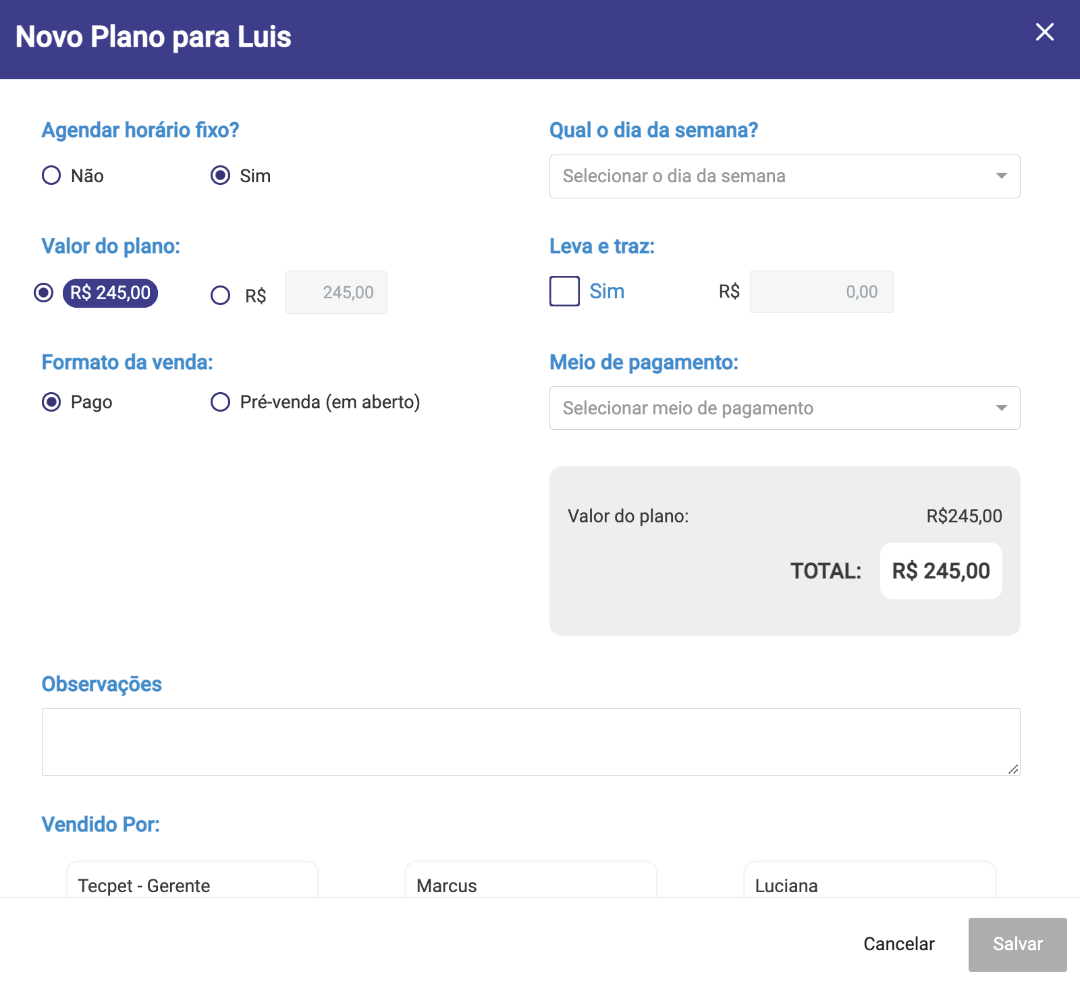 Um pouco mais abaixo da Etapa - 02, possuímos algumas outras informações que devem ser preenchidas, no caso do valor do plano, pode ser alterado manualmente no ato da venda, da mesma forma que é possível adicionar um serviço de leva e traz com o seu devido valor e informar o meio de pagamento. E para finalizar, devemos selecionar o funcionário que realizou a venda.