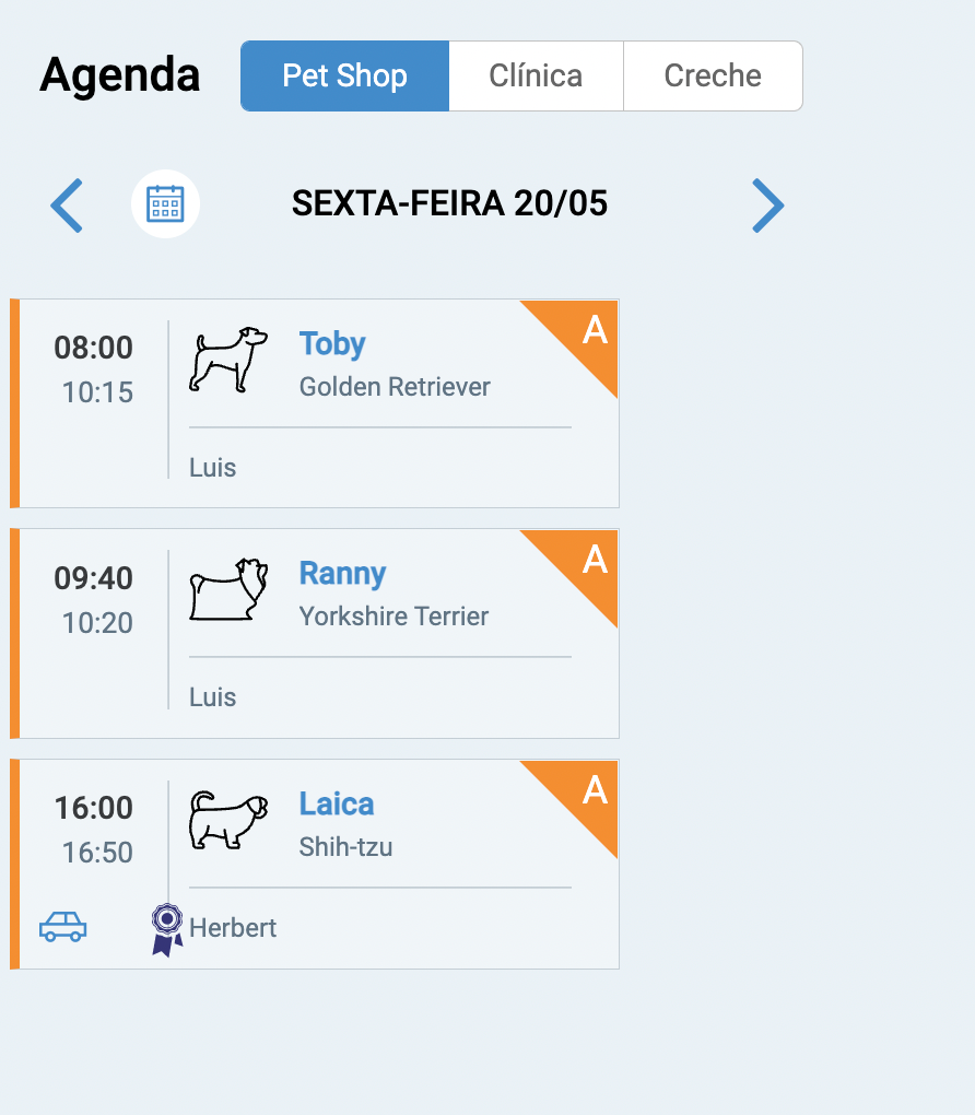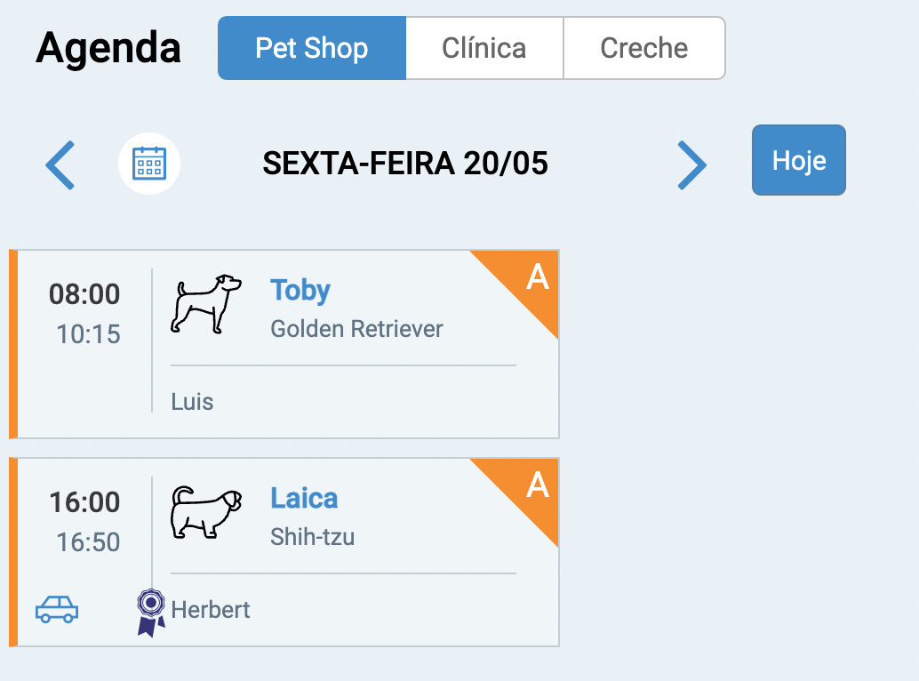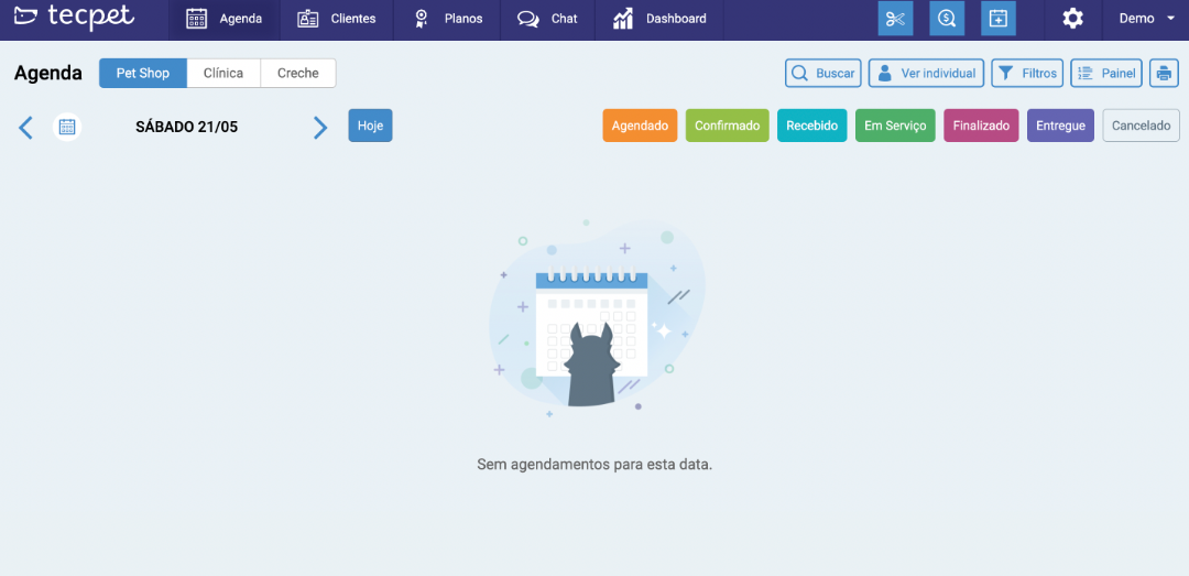 Filtro relacionado a agenda por segmentação, ou seja, cada segmentação (Pet Shop, Clínica, Creche e Hotel) possui sua própria agenda.
