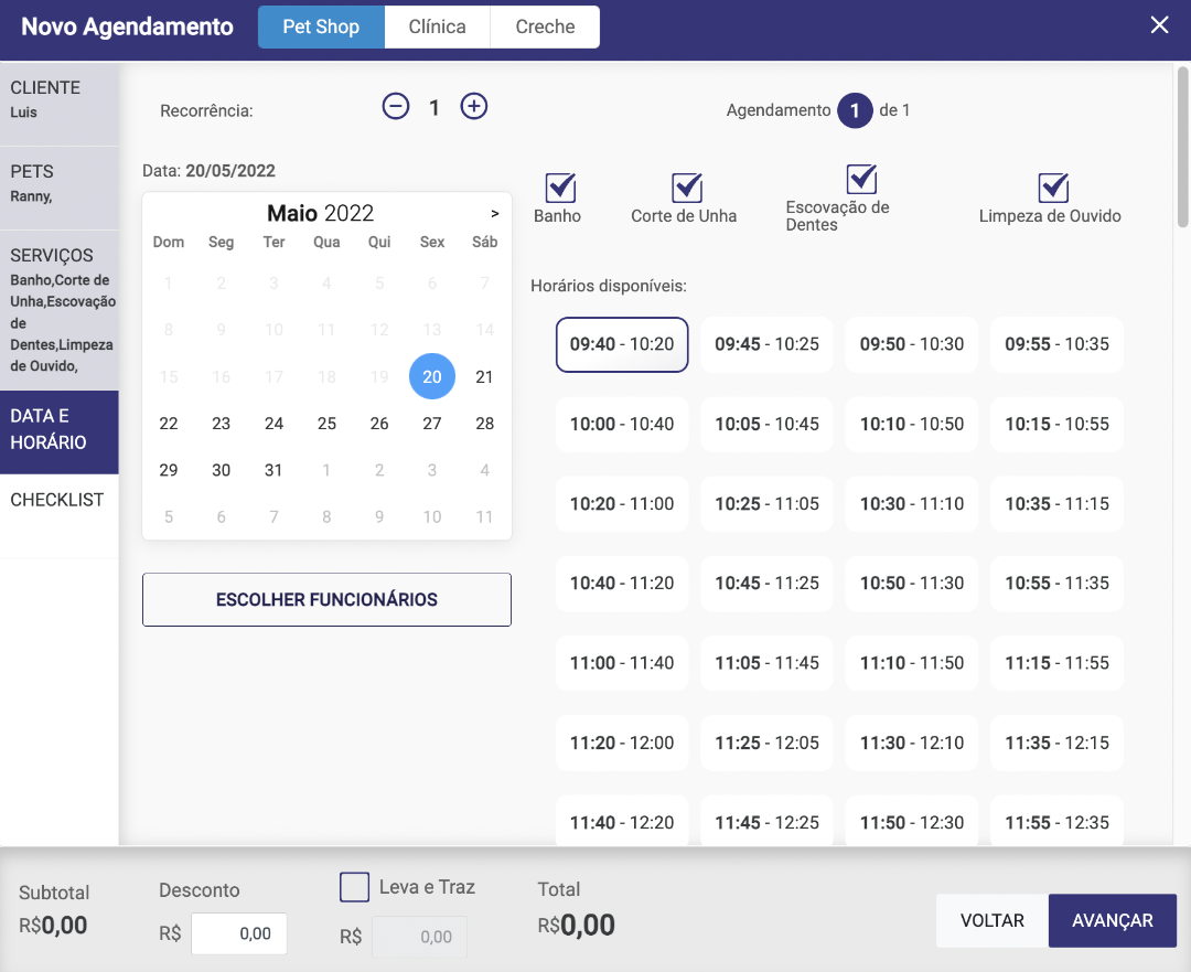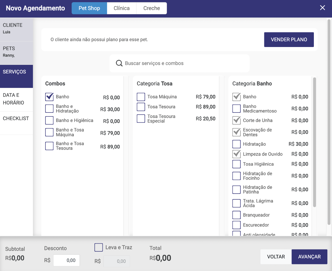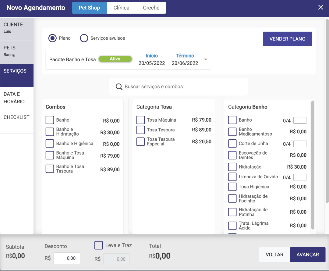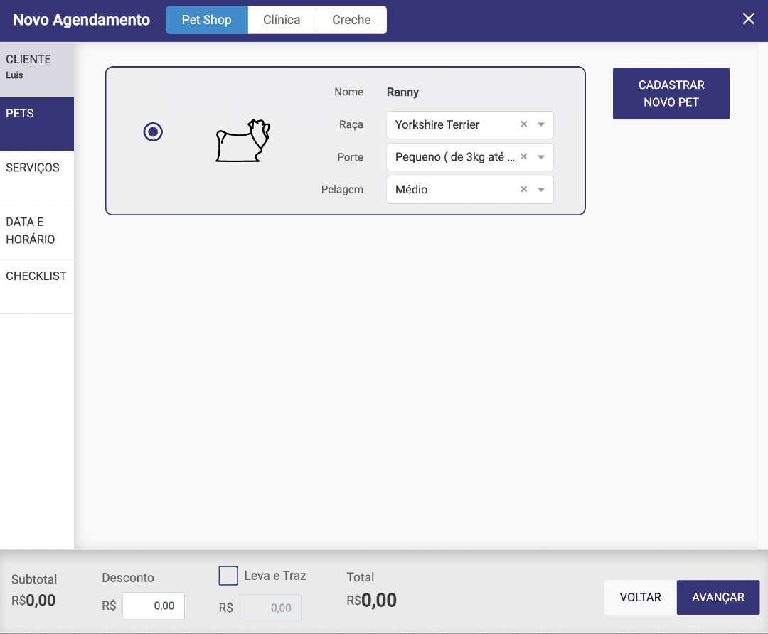 Na etapa de serviços, iremos selecionar os serviços na qual o cliente solicitou, lembrando que os valores que estão sendo apresentados, são referentes aos valores cadastrados na tabela de porte x pelo, no cadastro do serviço. OBS: Caso haja o serviço de leva e traz incluso, basta selecionar o leva e traz e informar o valor do mesmo.