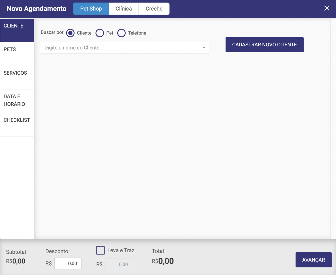 Após clicar no ícone de novo agendamento, irá abrir essa tela, na primeira parte, será referente a busca do cliente, na qual pode ser feita por: Nome do Cliente, Nome do Pet ou Telefone.
