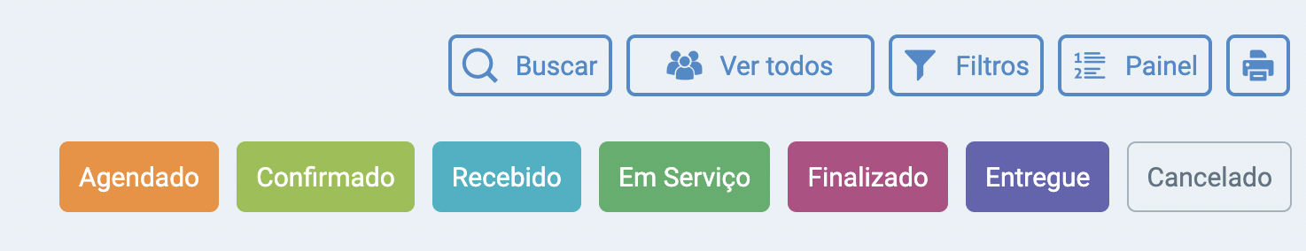 Os retângulos coloridos, são referentes ao passo em que se encontra um determinado agendamento, como por exemplo, Agendado, Confirmado, Recebido, Em Serviço, Finalizado e Entregue, sendo esse o fluxo de um agendamento.
