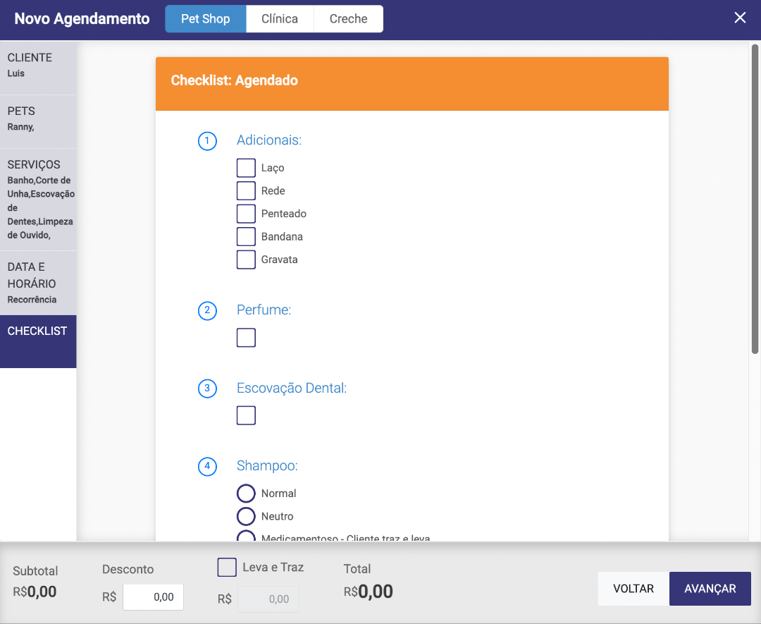 Como penúltima etapa, iremos apenas conferir o checklist do agendamento, caso ele tenha sido preenchido no cadastro do pet, as informações irão ser puxadas automaticamente.