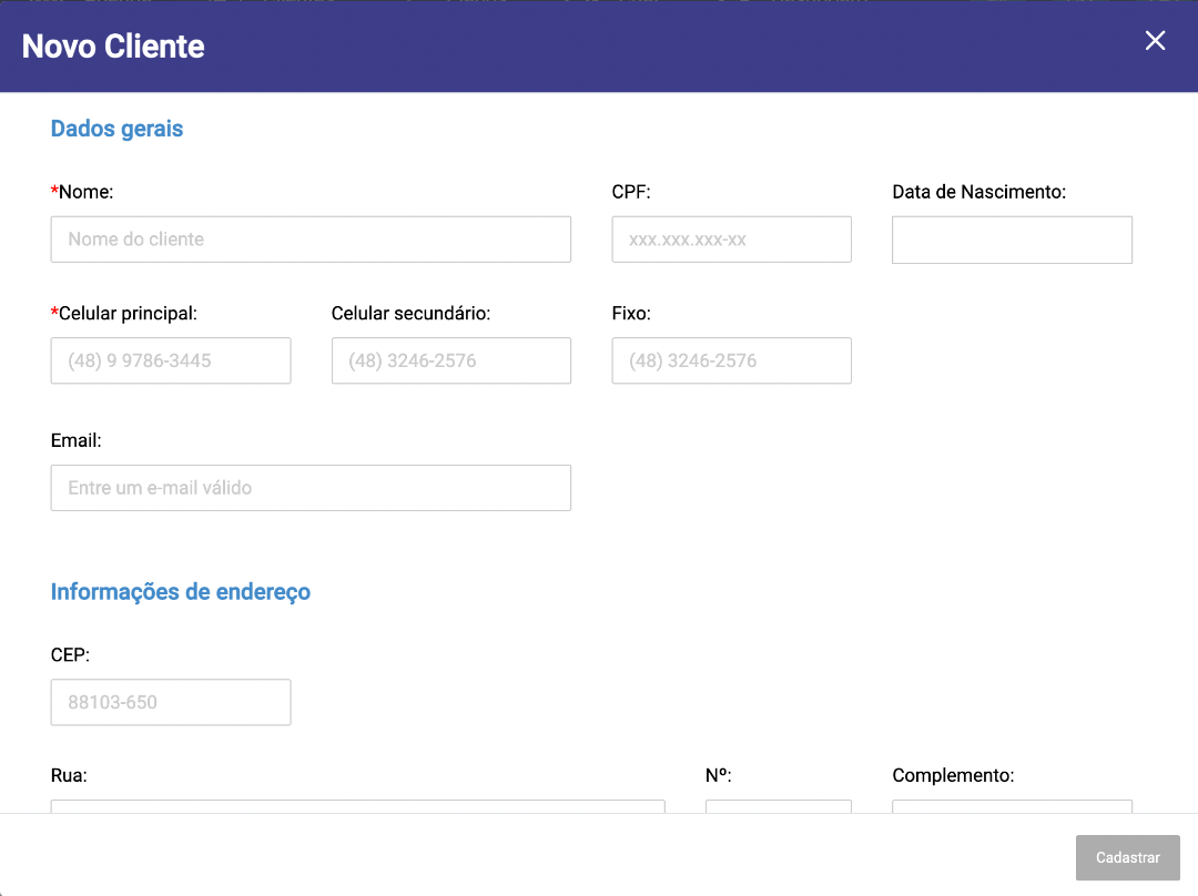 Para os clientes ainda não cadastrados, é necessário preencher os campos: Nome e Celular. O campo de endereço não é obrigatório, porém caso utilize o sistema de leva e traz, é interessante já preencher.