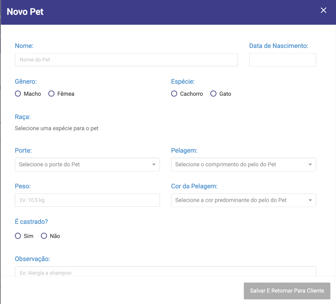 Nessa etapa iremos cadastrar um novo cliente, caso o cliente e o pet já estejam cadastrados, pular para a etapa 05.