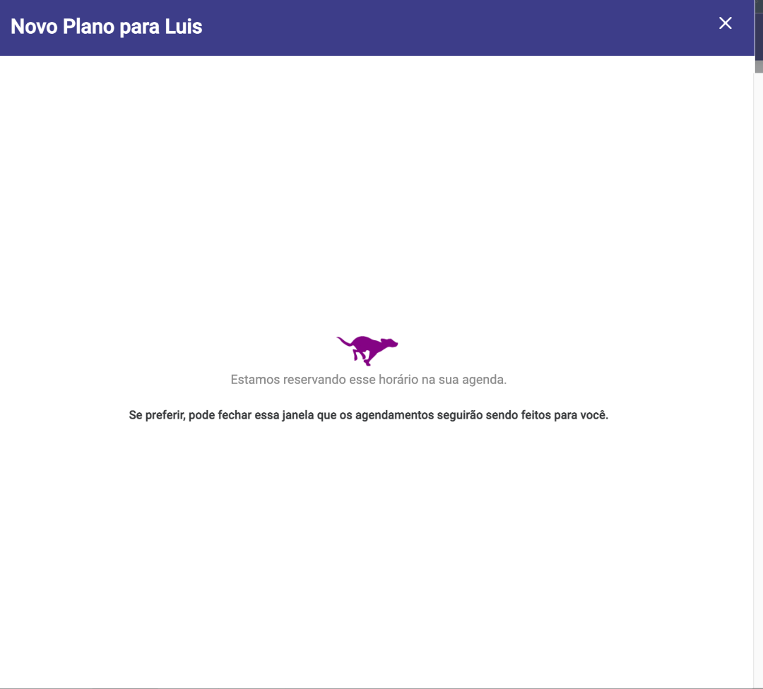 Após a ETAPA - 03, caso o nosso plano e pacote estejam com o horário fixo, selecionamos o dia e o horário que o cliente deseja e finalizamos, iremos nos deparar com essa tela, nesse caso não é necessário esperar ela carregar!!!!!!! Ela de fato pode ser fechada e nos dias e no horário na qual foi agendado o serviço, já irá constar na nossa agenda.